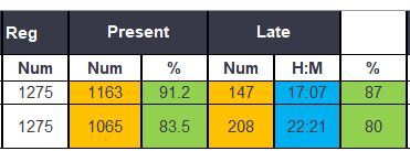 In the Summary with Lates registration report, it shows the number of Hours and minutes pupils are to late to lessons.