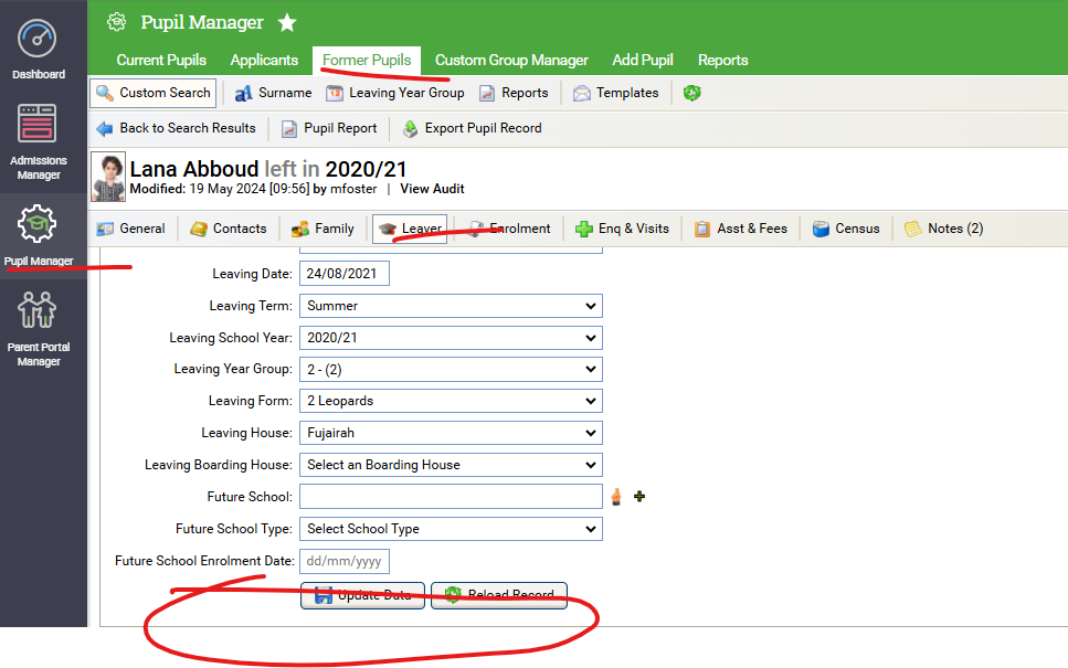 Withdrawal notes field can be added to leaver tab, under former on pupil manager.