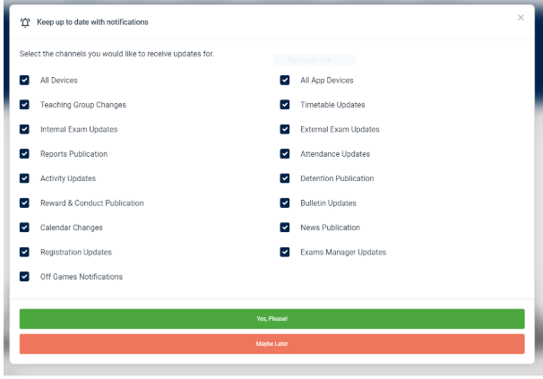 Currently users of the Cloud Parent Portal will see the attached options when they login to the portal for the first time. Schools will not necessarily use all/any of these notification channels, so these options will be misleading for parents. Please can we have the ability to disable or configure this pop-up.