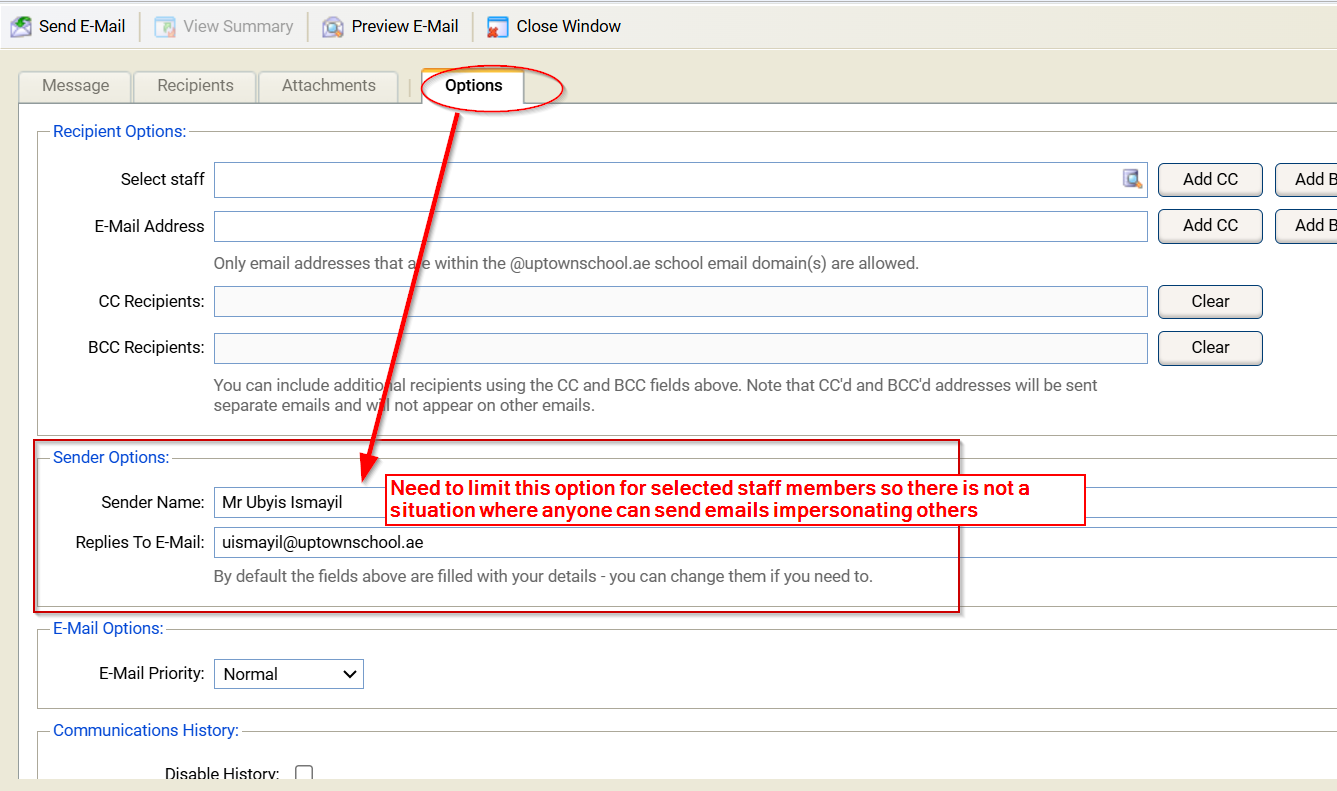 Allowing staff to send emails as others poses security risks, such as misuse of sensitive information. Restricting this feature ensures that emails are sent only by the authorized user, protecting communication integrity.
