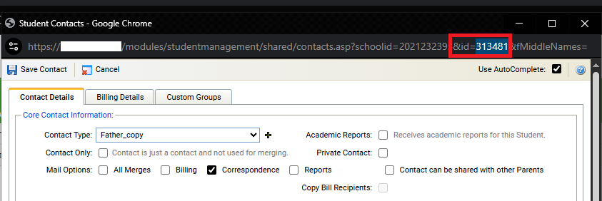 In some ocasions we have detected duplicated parents, normally in families that have not been properly linked. It would be very useful to compare a Contact record by the isams internal Contact ID (this field is available for export in Export Wizard), my suggestion is to have it visible somewhere in the contact record.