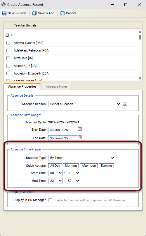 When setting absences, by default, the time range is set to All Day, so from midnight to 23.59. Notice that there is no visual highlighting on the screen to indicate that All Day has been selected. Even when you explicitly click on All Day, there is still no on-screen clue to the fact that you have clicked it.