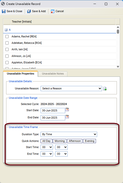 When setting unavailable staff, if you are used to defaulting to All Day with absences, there is no visual indication that this hasn’t already been defaulted to. In this case, you have to explicitly click the All Day option. Again, even when you have done this, there is no on-screen clue that you have clicked this option (as opposed to one of the other options).