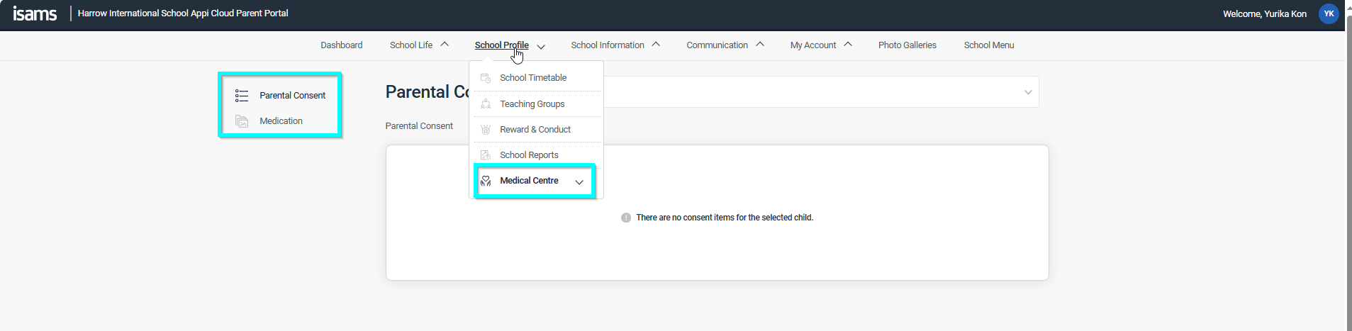 Our parents have 'Medical Centre' menu displayed on their Parent Portal now, while they can only see 'Parental Consent' and 'Medication' sections (as attached screenshot from my test account), which have no data (as we use another system to record these data).