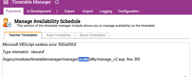 From my correspondence with ISAMS Support, if you filter by an alphabets that is expected to return zero results, a VBScript runtime error will be shown. E.g. you filter by the letter Q but you have no teachers beginning with Q.